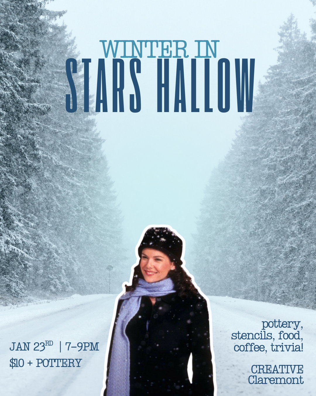Do you consider yourself an Ultimate Gilmore Girls Fan? Join us to paint a custom Gilmore Girls pottery piece while putting your knowledge to the test during our trivia game while enjoying the Starts Hollow themed coffee & food coma bar that only Lorelai and Rory could handle! You'll have to pace yourself or you will be in a sugar coma faster than Lorelai can confuse Taylor at a town meeting!